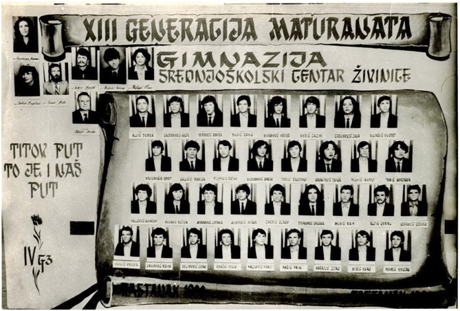 Ovaj pano je uradio i dekorisao naš poznati umjetnik Rahman Šabanović. Bio je izložen u nekom izlogu pored naše Gimnazije. Tu je stajao sve dok od sunca nije izblijedio. Fotografije je radio čuveni fotograf Žika sa starog trga, koji je znao bijelim tušem na fotografijama skidati poneku bubuljicu sa naših lica. Zato smo najviše voljeli njegove fotografije,jer iako su bile retuširane, za nas su bile najljepše.